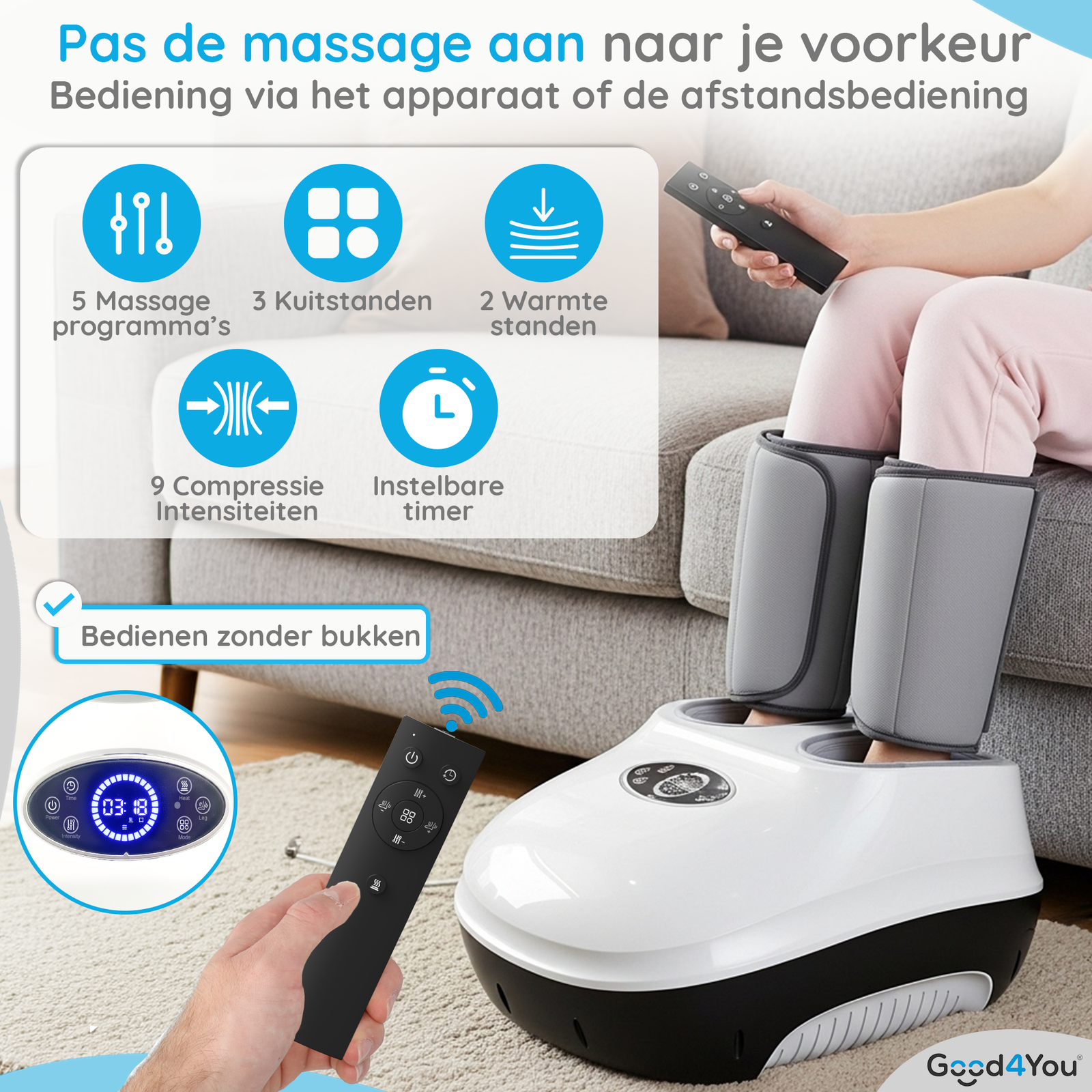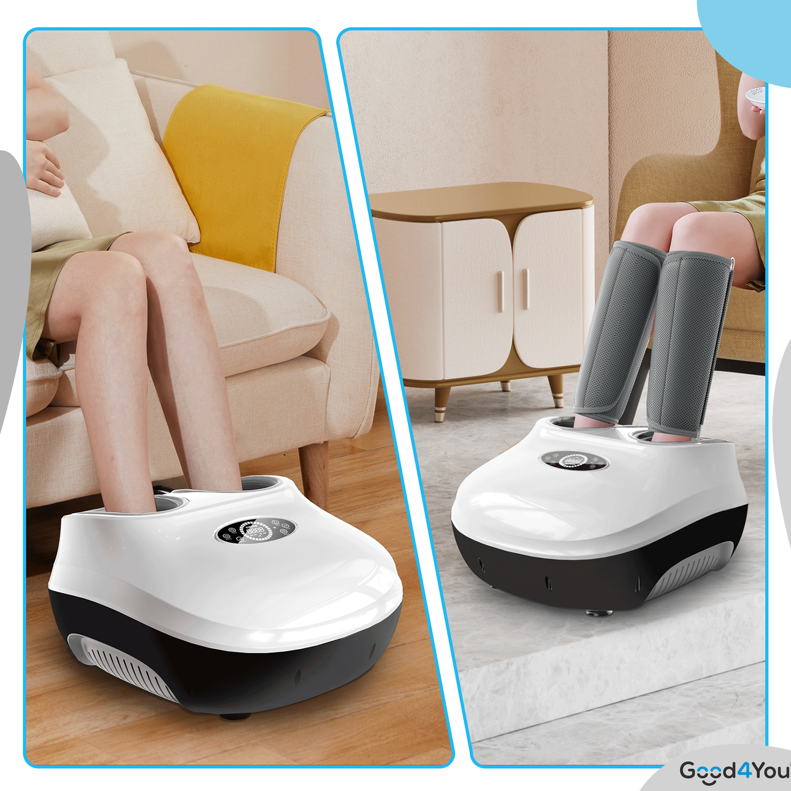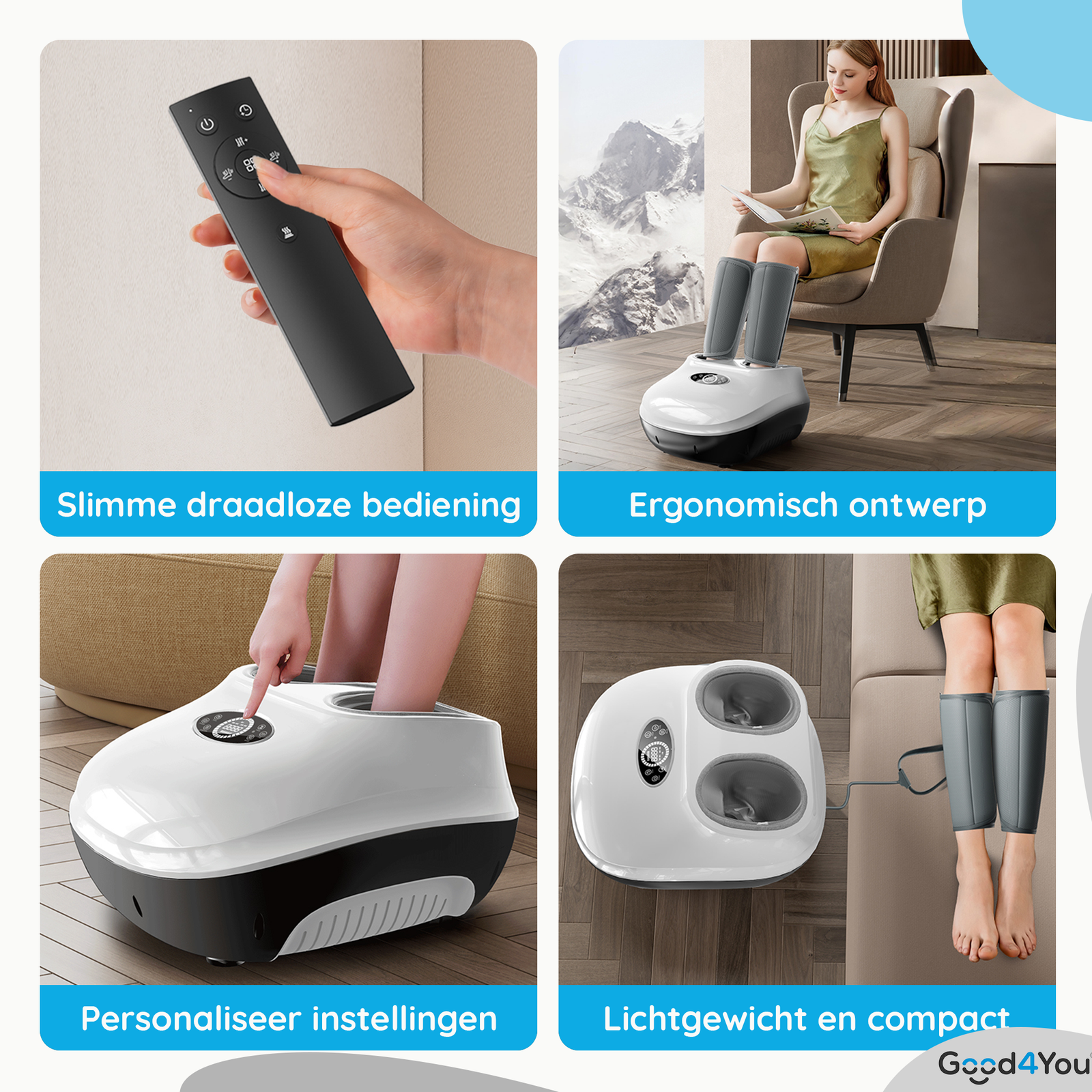 Ervaar professionele ontspanning gewoon bij jou thuis met het Good4You® 2-in-1 Voet- en Kuitmassageapparaat. Dankzij de combinatie van Shiatsu-massage, luchtcompressie en warmte helpt dit apparaat vermoeide voeten en benen te ontspannen, stimuleert het de doorbloeding en ondersteunt het het herstel van spieren na een lange dag werken, sporten of lopen.
