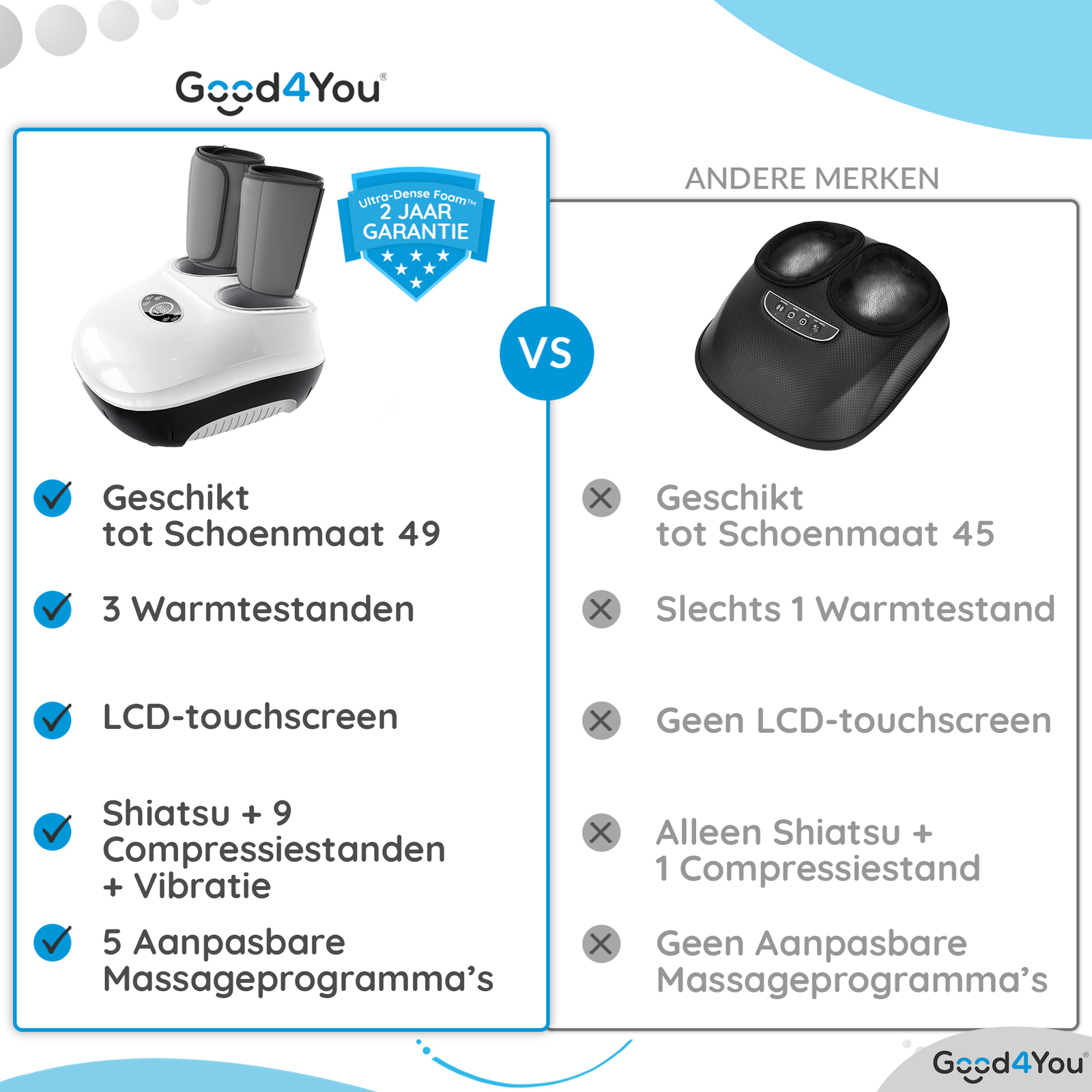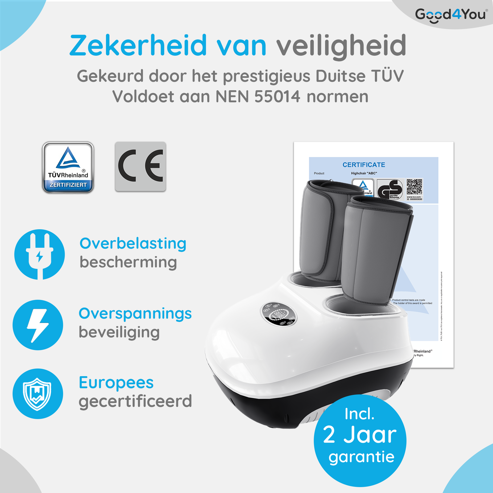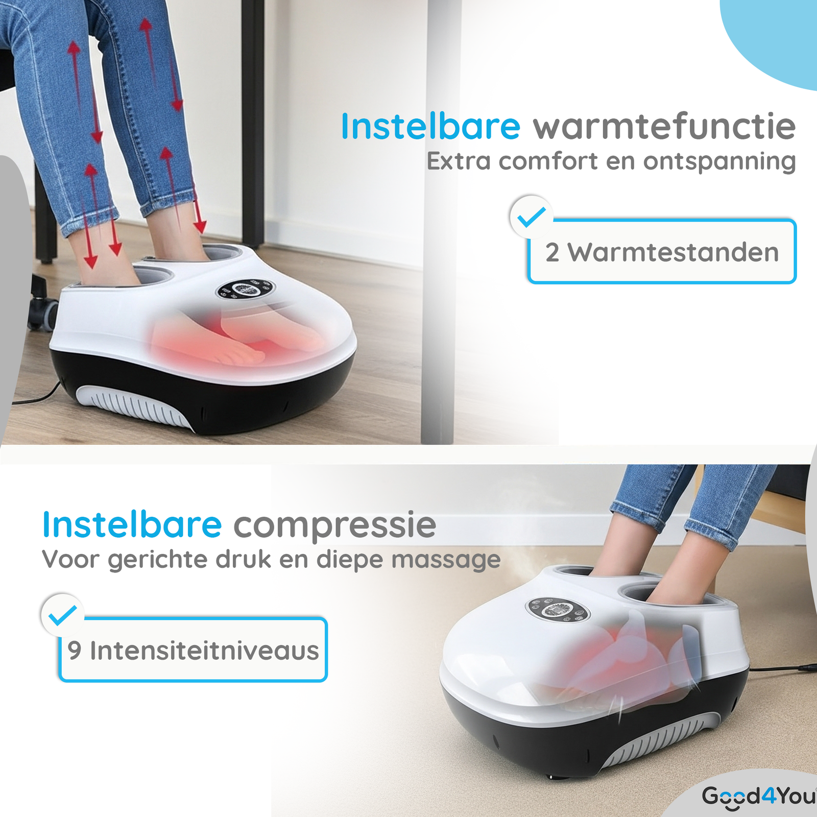 Ervaar professionele ontspanning gewoon bij jou thuis met het Good4You® 2-in-1 Voet- en Kuitmassageapparaat. Dankzij de combinatie van Shiatsu-massage, luchtcompressie en warmte helpt dit apparaat vermoeide voeten en benen te ontspannen, stimuleert het de doorbloeding en ondersteunt het het herstel van spieren na een lange dag werken, sporten of lopen.