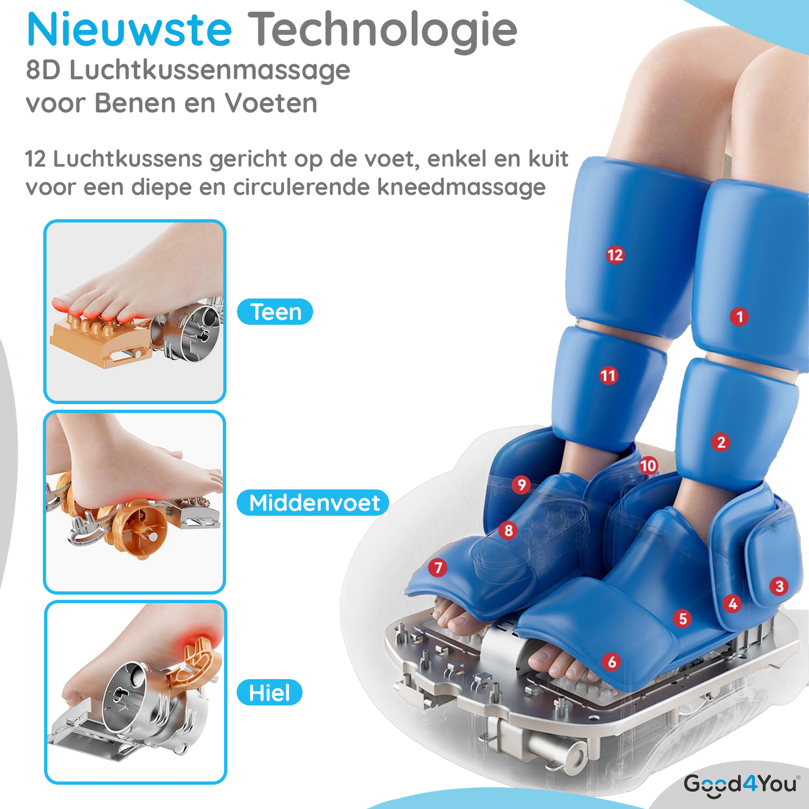 De 8D-luchtkussenmassage met 12 luchtkussens zorgt voor gerichte compressie rond voeten, enkels en kuiten. Afhankelijk van het gekozen programma werken de luchtcompressie (airbags) en massagerollen samen of afzonderlijk.