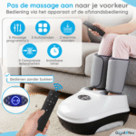 De luchtcompressie werkt via 12 airbags die ritmisch druk uitoefenen op voeten, enkels en kuiten. Dit helpt de bloedcirculatie te stimuleren, spanning te verminderen en vermoeidheid in de benen te verlichten.