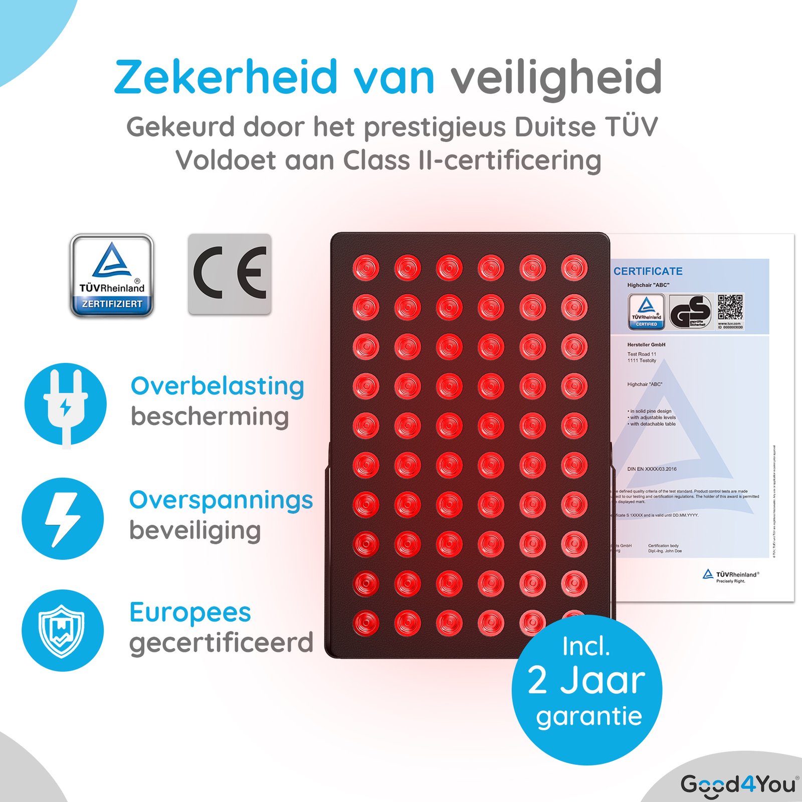 De lamp is TÜV-gecertificeerd, volledig vrij van EMF-straling en voorzien van overspanningsbeveiliging. Het geïntegreerde koelsysteem zorgt voor een constante luchtcirculatie, zodat de lamp koel blijft, zelfs bij intensief gebruik. Bij gebruik op het gezicht adviseren we de meegeleverde beschermbril voor extra veiligheid.