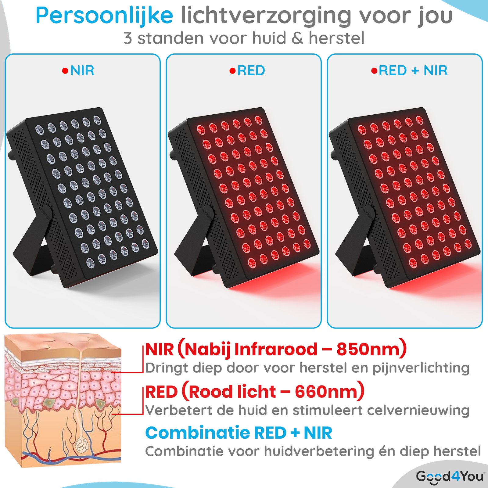 Of je nu huidproblemen wilt aanpakken, pijnklachten wilt verminderen of simpelweg beter in je vel wilt zitten – lichttherapie biedt een natuurlijke en bewezen oplossing. De Good4You® LED Infraroodlamp helpt je lichaam herstellen en je huid stralen, met technologie die écht werkt.