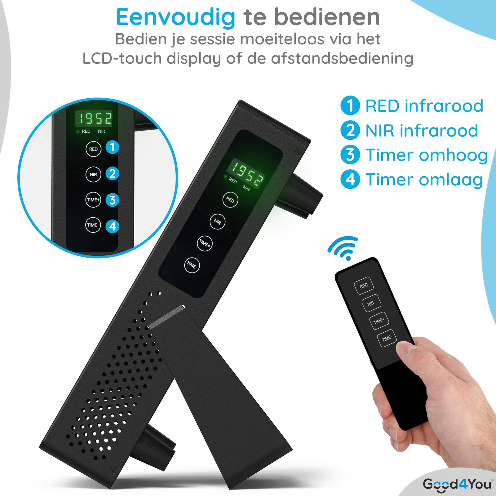 De Good4You® Infraroodlamp heeft drie standen die je eenvoudig instelt via het touch display of de afstandsbediening. Kies uit rood licht (660nm), infraroodlicht (850nm) of een combinatie voor een gerichte behandeling. Rood licht stimuleert collageenaanmaak en huidvernieuwing, terwijl infrarood dieper inwerkt op spieren en gewrichten om pijn, ontsteking en spanning te verlichten.