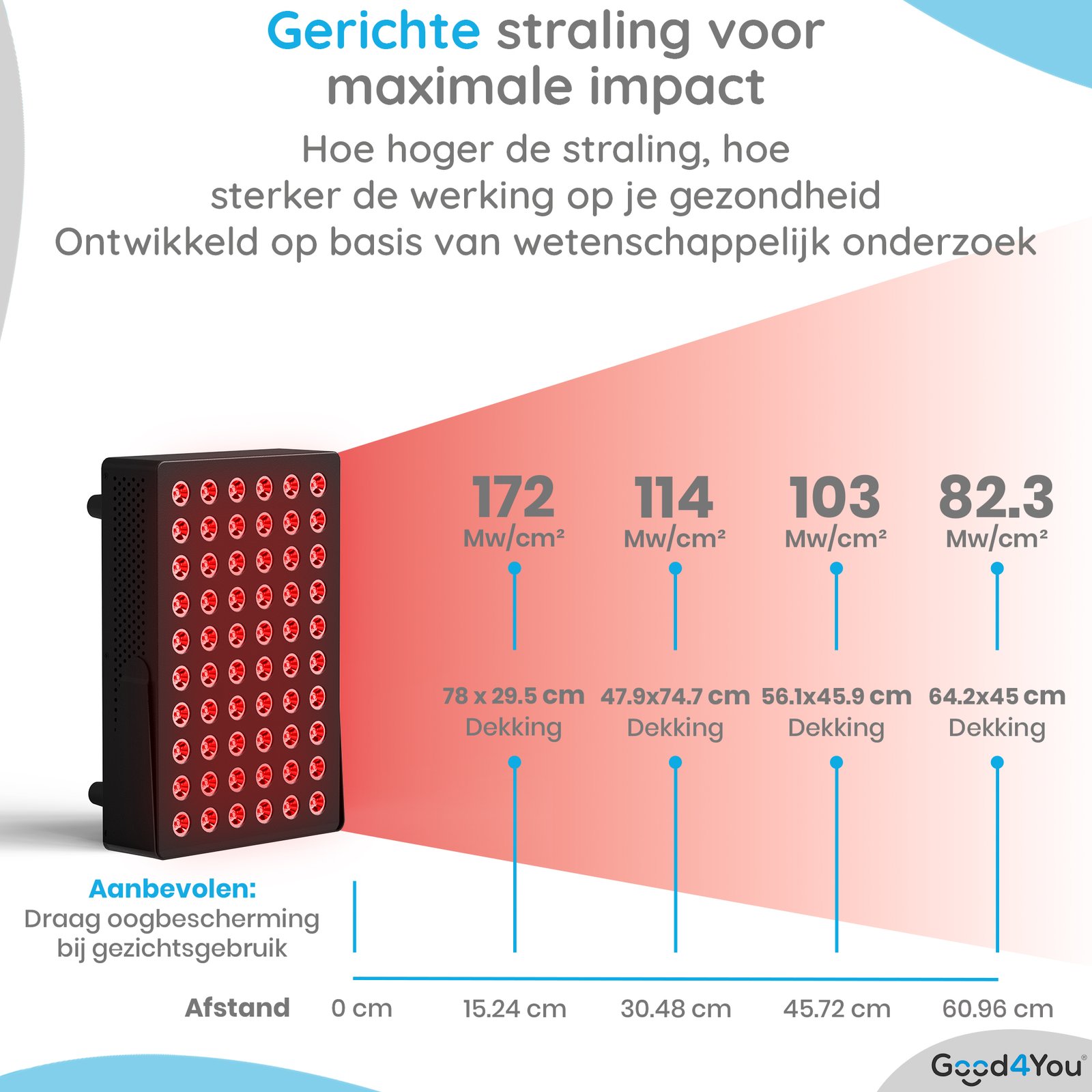 1 x Good4You® LED Infraroodlamp, 1 x Afstandsbediening, 1 x Stroomadapter, 1 x Beschermbril, 1 x Gebruiksaanwijzing