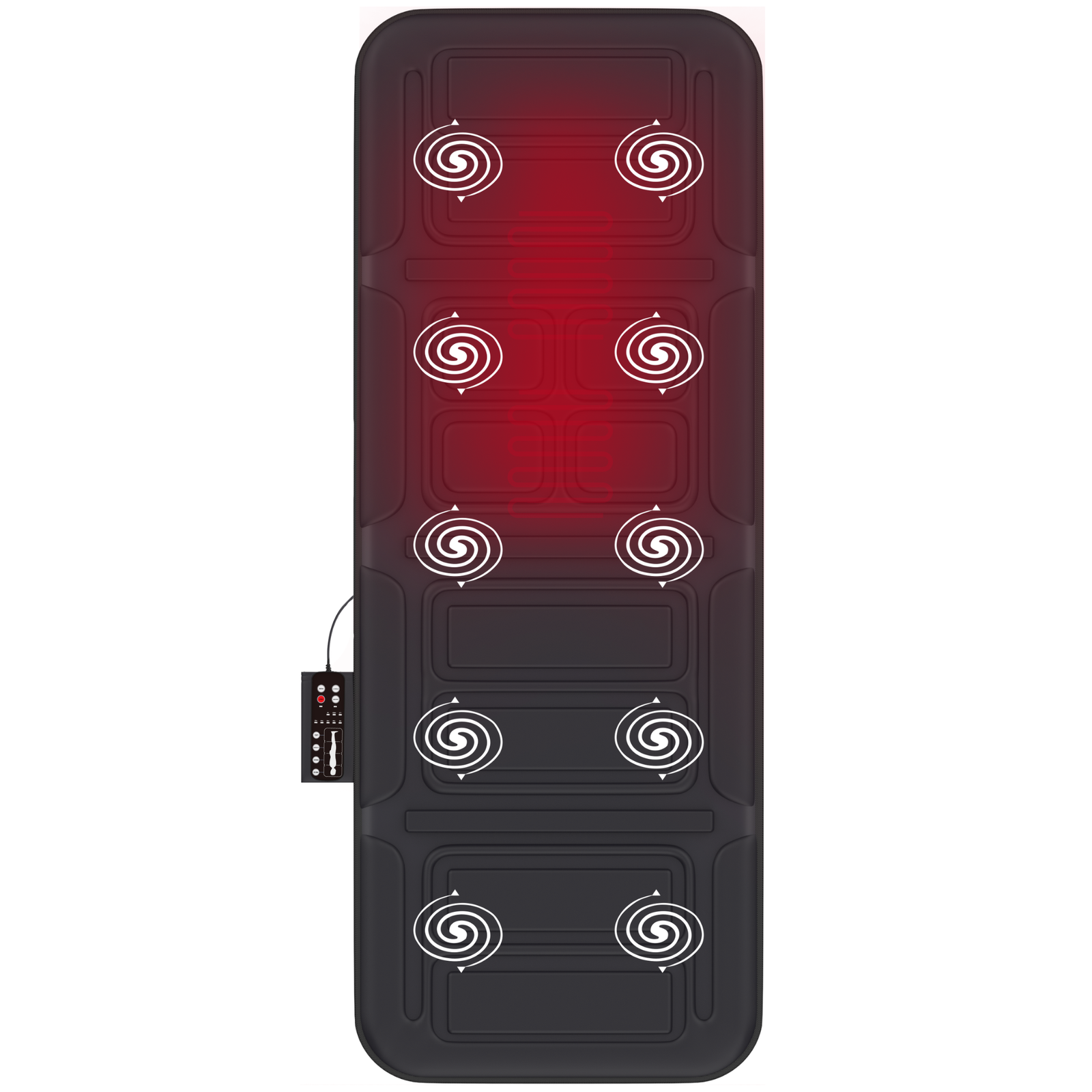 De massagemat heeft 10 individuele vibratiemotoren verdeeld over 4 verschillende zones (nek/schouder, middenrug, onderrug, benen/dijen) voor een gerichte en ontspannende massage. Je kunt elke zone afzonderlijk selecteren om specifieke spierspanningen te verlichten.