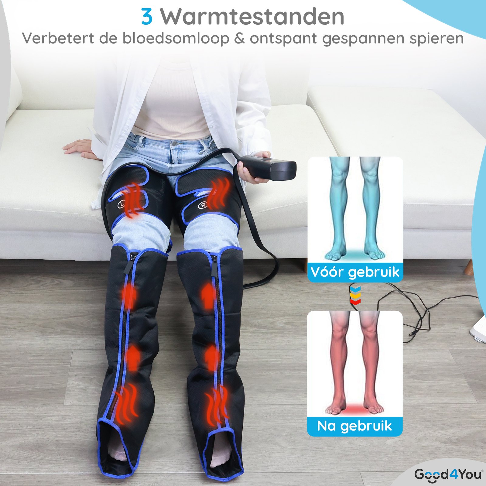 Of je nu lang staat, intensief sport of veel zit: je benen maken wat mee. Het Good4You® Beenmassageapparaat is ontworpen om je te helpen ontspannen, herstellen en beter in je vel te zitten. Dankzij de krachtige luchtcompressietechnologie, 6 massageprogramma’s, 3 intensiteitsstanden en 2 warmtestanden ervaar je elke dag opnieuw de luxe van een professionele massage – gewoon bij jou thuis.